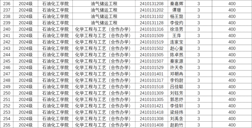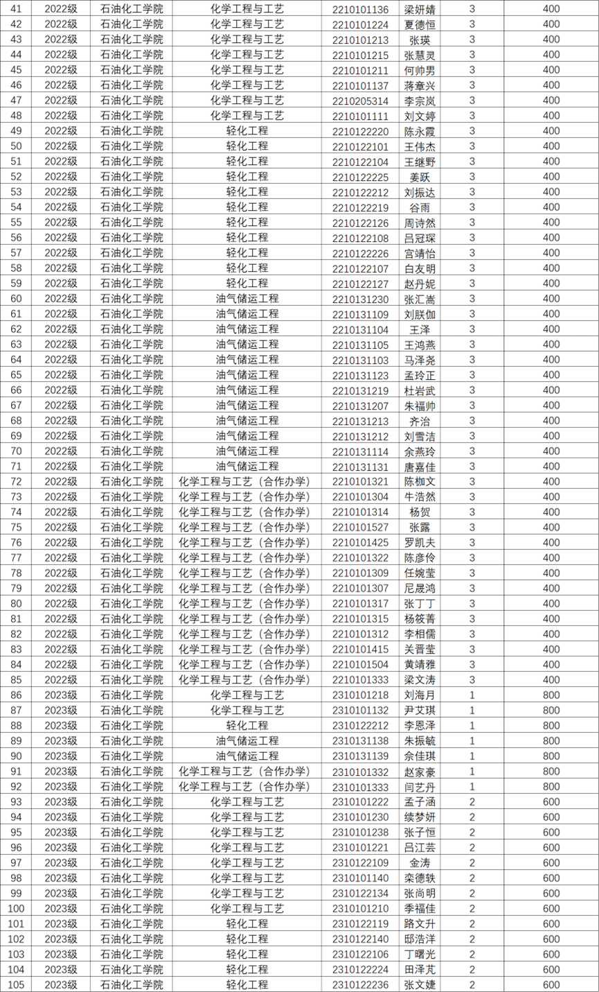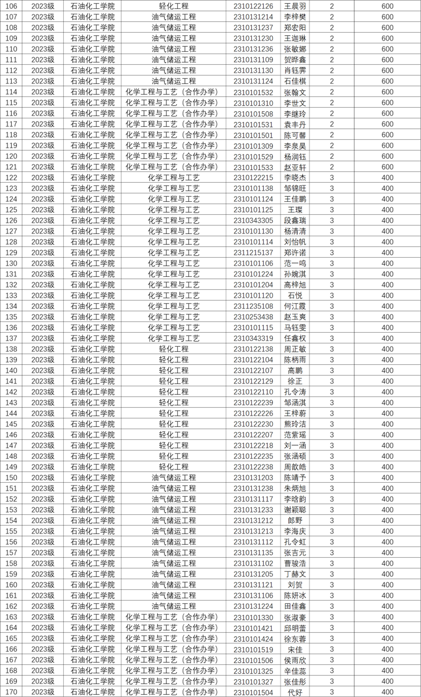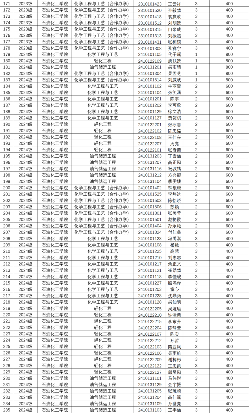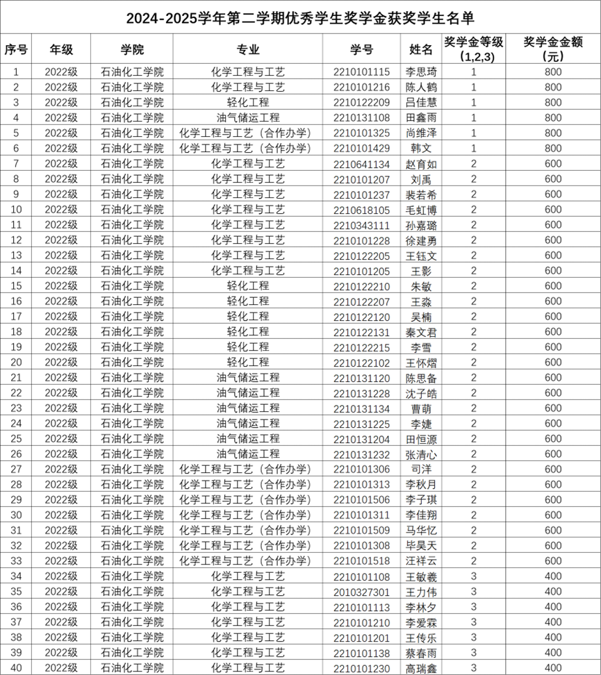 关于评定石油化工学院2024-2025学年学习奖学金的通知,根据教学院相关规定同时参照学生2024-2025学年第二学期的期末考试成绩,经学院审核评定,现将学习优秀奖学金获奖学生名单向全教学院公示。