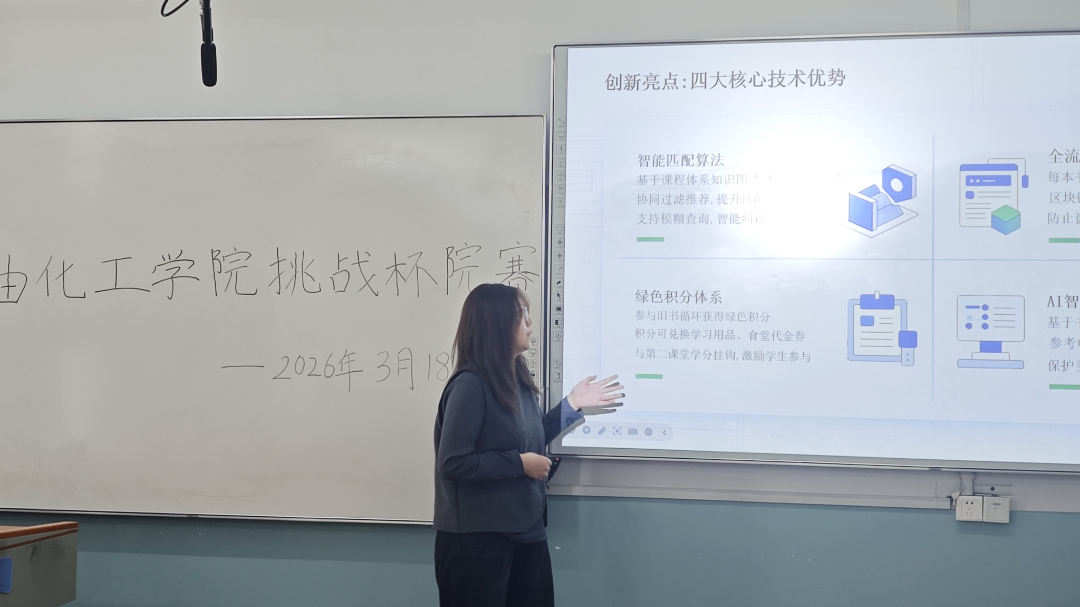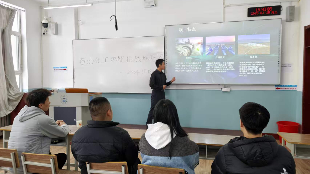 为厚植学院创新创业氛围,激发学子科创热情,选拔优质参赛作品晋级校级竞赛,2026年3月18日,吉林化工大学石油化工学院“挑战杯”院级选拔赛在第一教学楼顺利举办。学院专业骨干教师与优秀学生代表共同组成评委团队,全院各参赛团队携精心筹备的项目悉数亮相、同台竞逐。