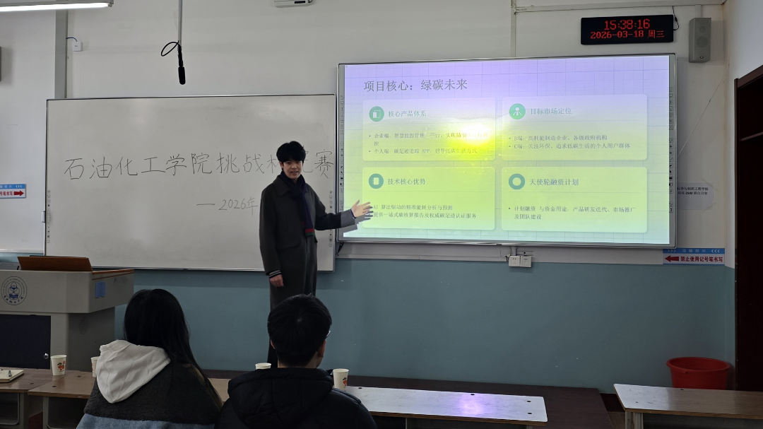 本次院赛紧扣“创新·创业·成长”主题,参赛项目覆盖化工工艺优化、新材料研发、绿色环保技术、社会治理调研等多个方向,充分结合石油化工专业特色与时代发展需求。展示环节中,各团队代表依次通过PPT演示、实物演示等形式,清晰阐述项目的研究背景、技术路径、创新亮点与应用价值。评委们从项目的科学性、创新性、可行性及团队协作能力等维度进行专业评审,针对项目细节提出针对性修改建议,并就市场前景、技术落地等关键问题与参赛选手展开深度交流,现场学术研讨氛围浓厚。