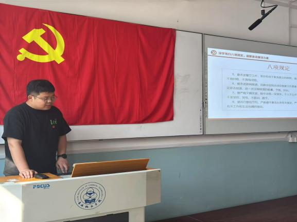 研究生党支部支部书记韩雨汐在总结发言中强调,全体党员要切实将八项规定精神落实到日常学习和科研工作中,严格遵守学术规范和科研经费使用规定,自觉抵制学术不端行为,在师生交往中保持清正廉洁作风,以实际行动维护良好的学术生态。