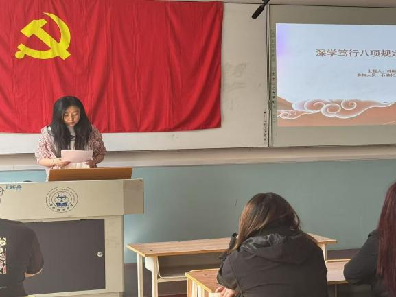 为深入贯彻党中央八项规定精神学习教育,推动全面从严治党向纵深发展,进一步加强作风建设,营造良好学习氛围,并发挥党员先锋模范作用,2025年5月27日,石油化工学院研究生党支部于第一教学楼203教室开展了“深学笃行八项规定,凝聚奋进廉洁力量”主题党日活动。研究生党支部支部书记韩雨汐参加了此次活动。