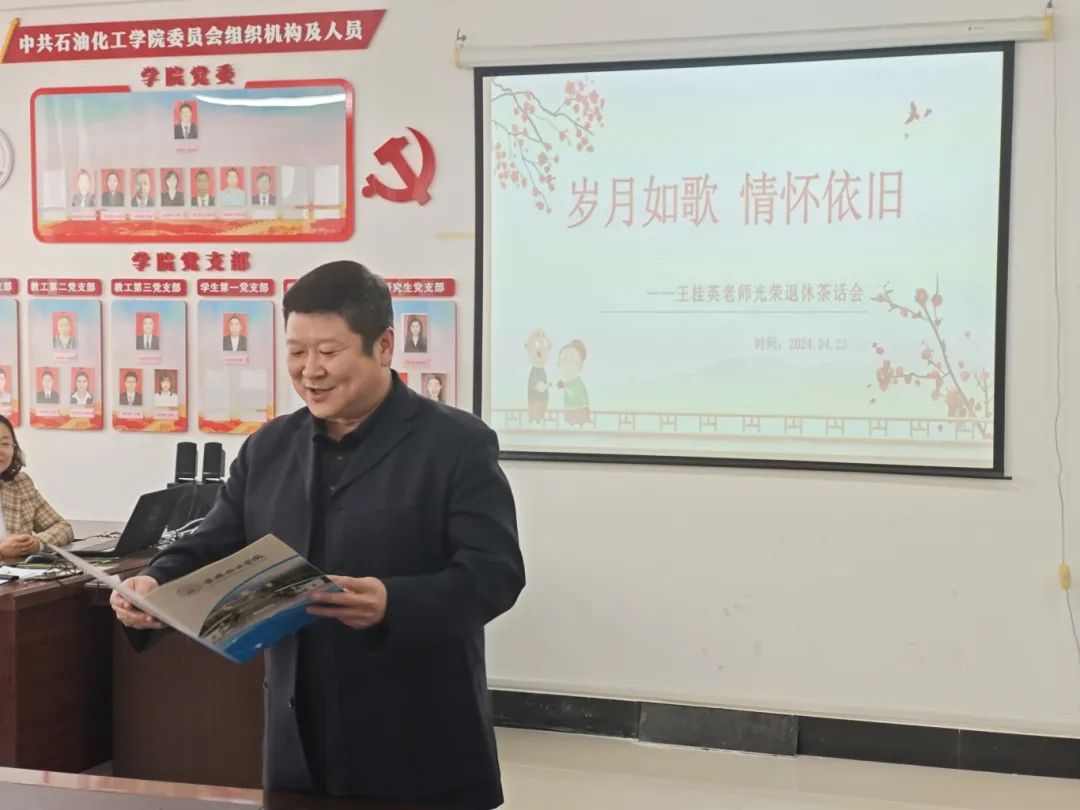 默默无闻献智慧,孜孜不倦耕耘心。2024年4月24日,石油化工学院于逸夫楼B座511会议室为王桂英老师举行荣休仪式。仪式由石油化工学院党委副书记、工会主席周桂莲主持,石油化工学院党委书记韩运华,院长张钰,副院长孙健、李瑞端,以及学院部分教师共同见证了这一温馨时刻。