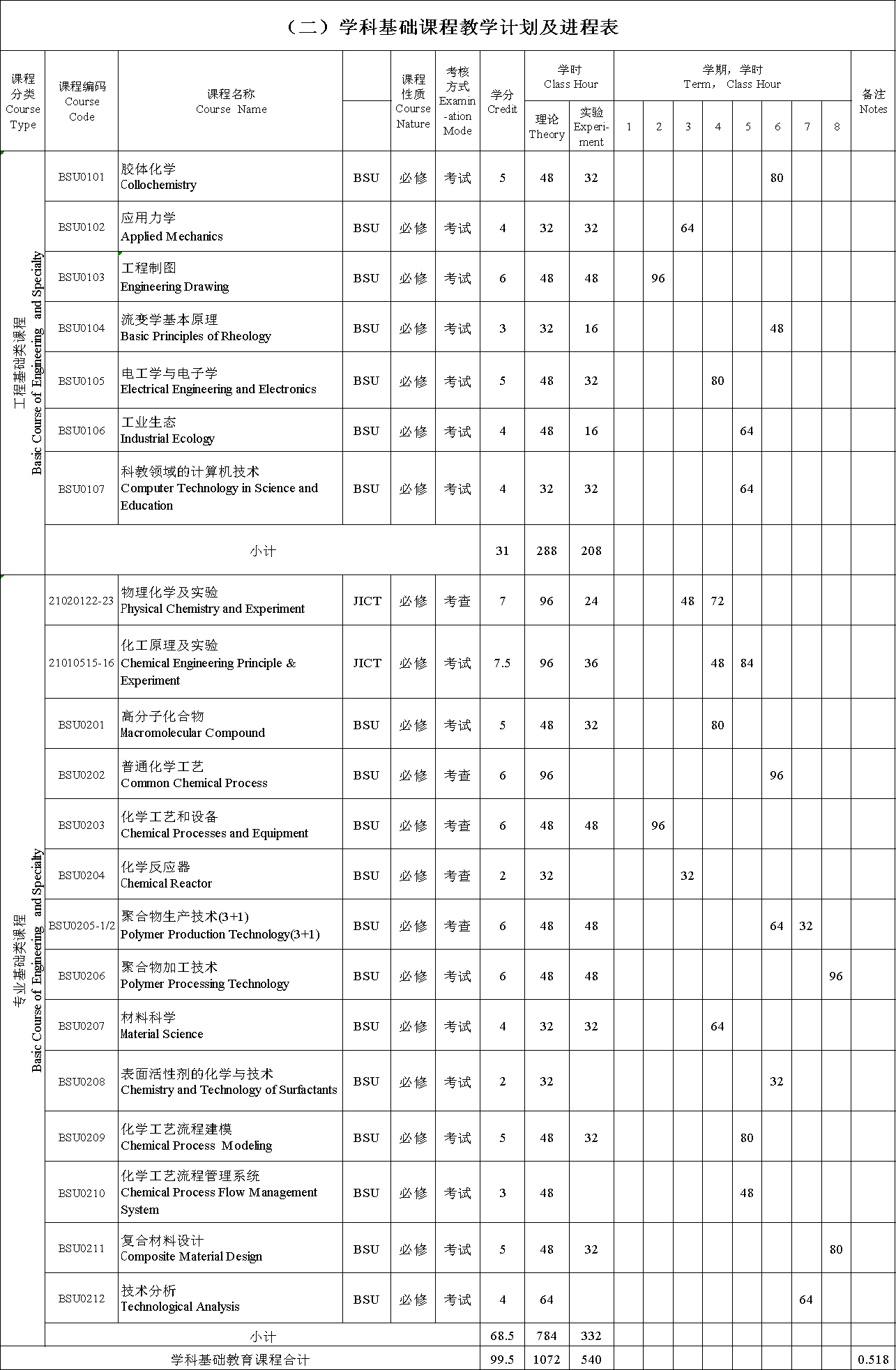 高等数学、线性代数、概率论与数理统计、大学物理及实验、无机与分析化学及实验、有机化学及实验、物理化学及实验、化工原理及实验、工程训练、化工生产实习、胶体化学、应用力学、工程制图、流变学基本原理、电工学与电子学、工业生态、科教领域的计算机技术、高分子化合物、普通化学工艺、化学工艺和设备、聚合物生产技术、化学反应器、材料科学、表面活性剂的化学与技术、化学工艺流程建模、化学工艺流程管理系统、毕业设计(论文)。