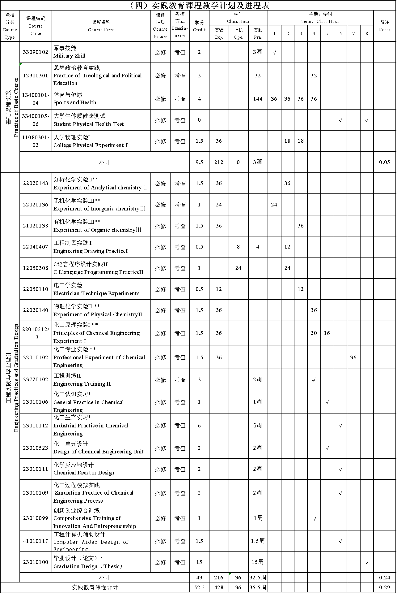 (一)主要实践性教学环节:工程训练、工程制图实践、化工认识实习、化工生产实习、化工单元设计、化学反应器设计、毕业设计(论文)等。