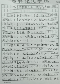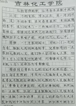 为积极响应“弘扬雷锋精神-让青春在奉献中绽放”的主题号召,石油化工学院特此开展了“传承雷锋精神,共筑时代新风”的主题征文活动。让同学们深刻体会“雷锋精神”的时代内涵,并展现新时代背景下雷锋精神的传承与升华。石化学子们以笔为媒介,横竖撇捺间精心勾勒,让雷锋精神的轮廓在笔下逐渐清晰。