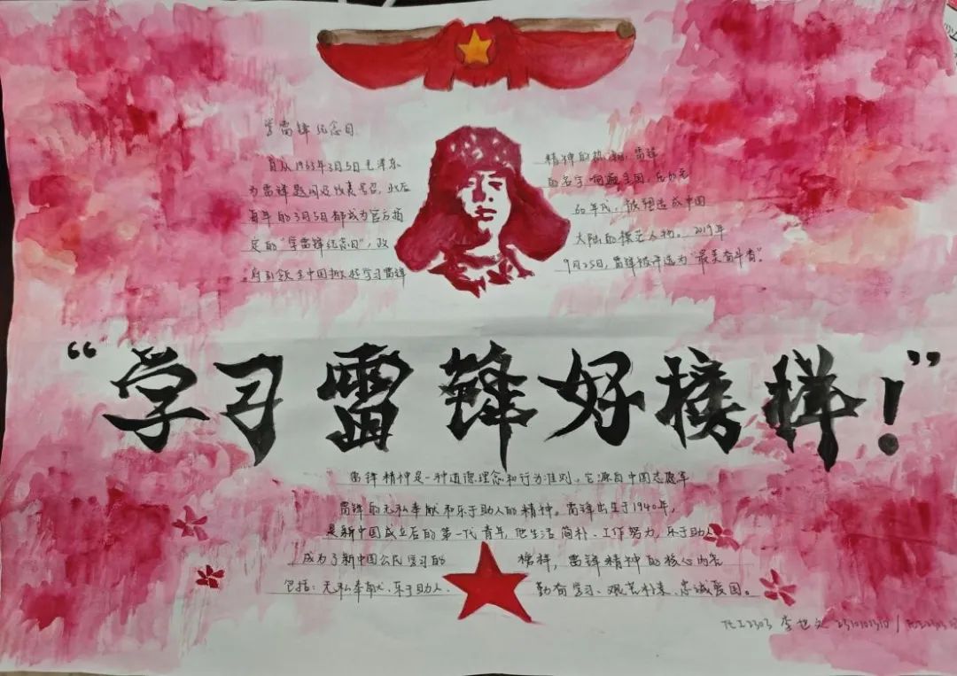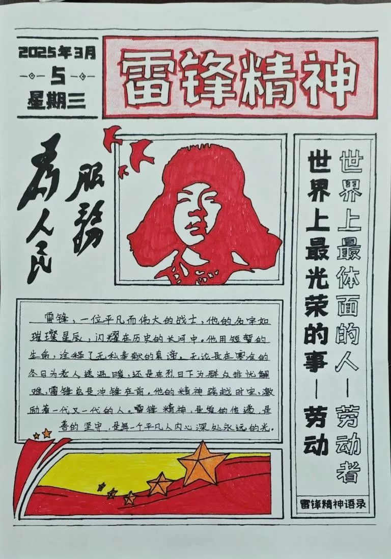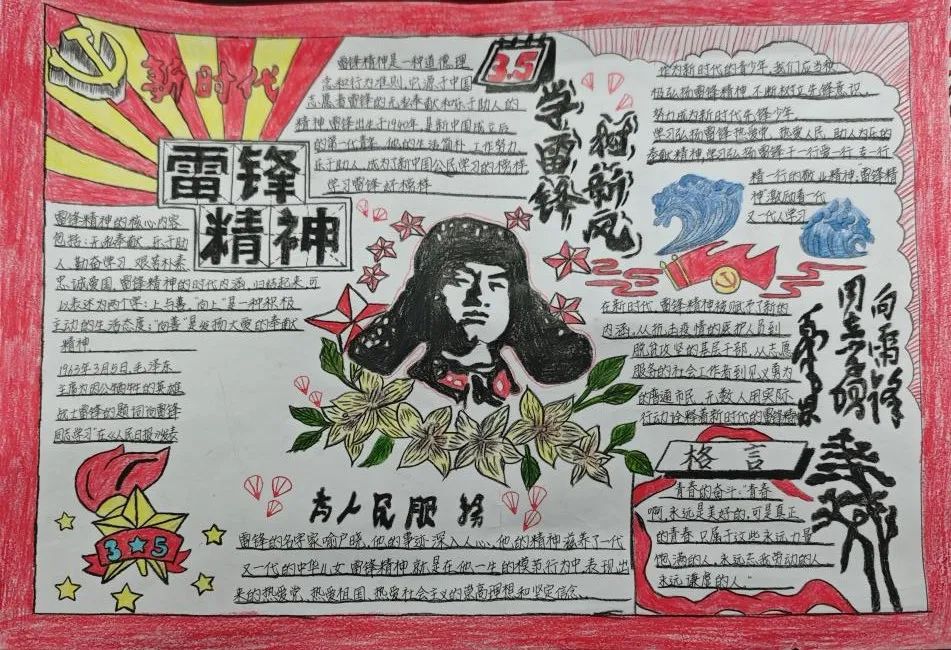 在征文活动进行的同时,“绘雷锋风采,展时代新风”手抄报评选活动也在学院内掀起热潮。石化学子们运用绚丽色彩、工整文字,精心描绘雷锋的光辉形象,深入诠释雷锋精神的内涵。一幅幅手抄报作品不仅展现出同学们卓越的艺术才华,更传递出对雷锋精神的深刻理解与崇高敬意。