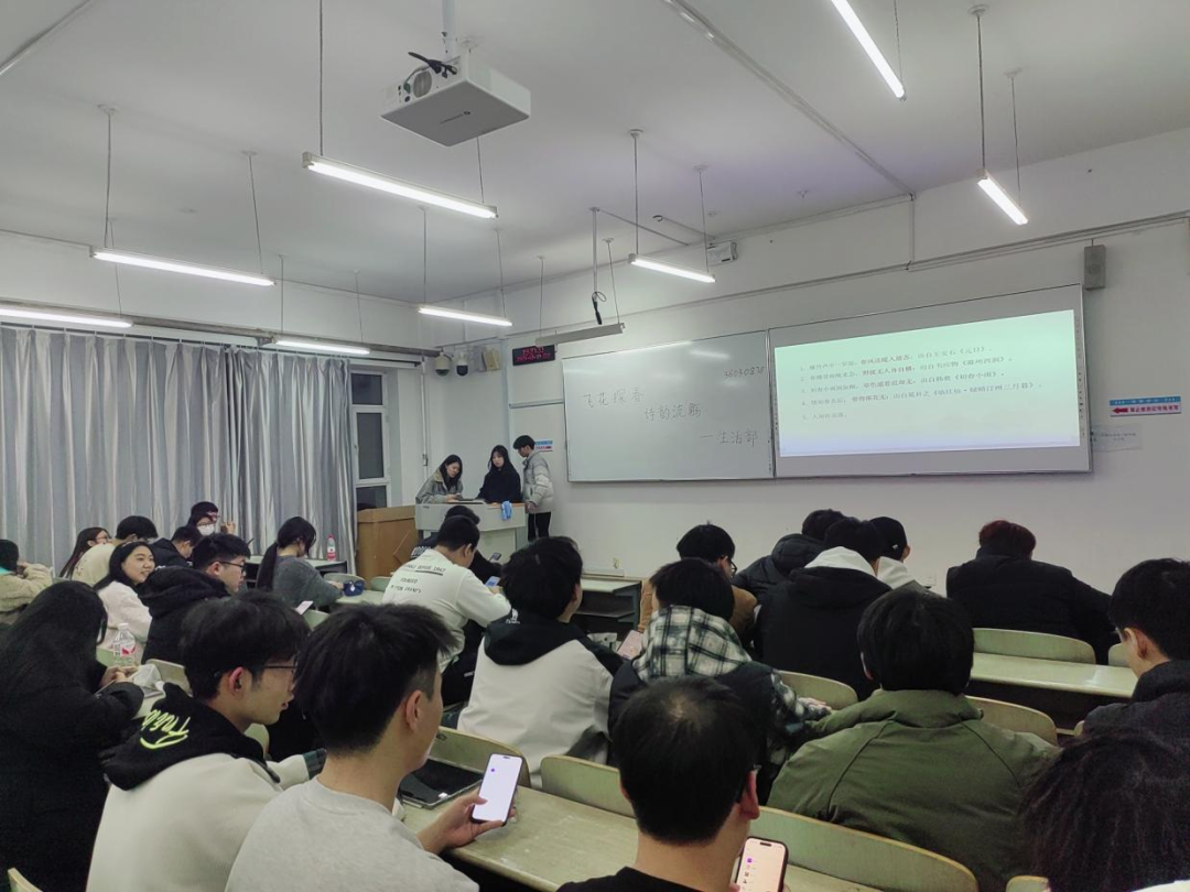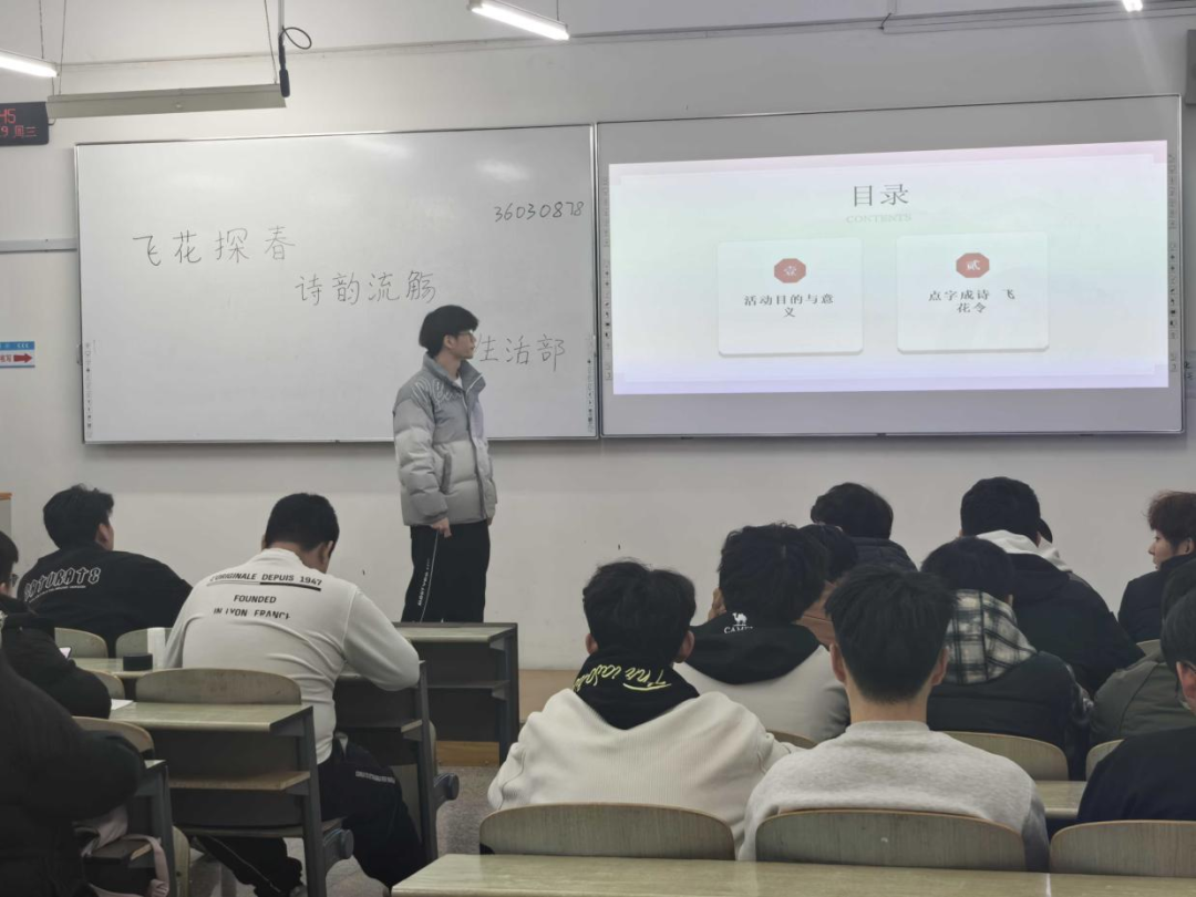 为弘扬中华优秀传统文化,丰富校园文化生活,提高同学们的文学素养。石油化工学院于2025年3月19日19:30在第三教学楼508教室举办“飞花探春,诗韵流觞”春日飞花令美育沙龙主题活动。同学们踊跃参与此次活动,现场气氛热烈非凡。