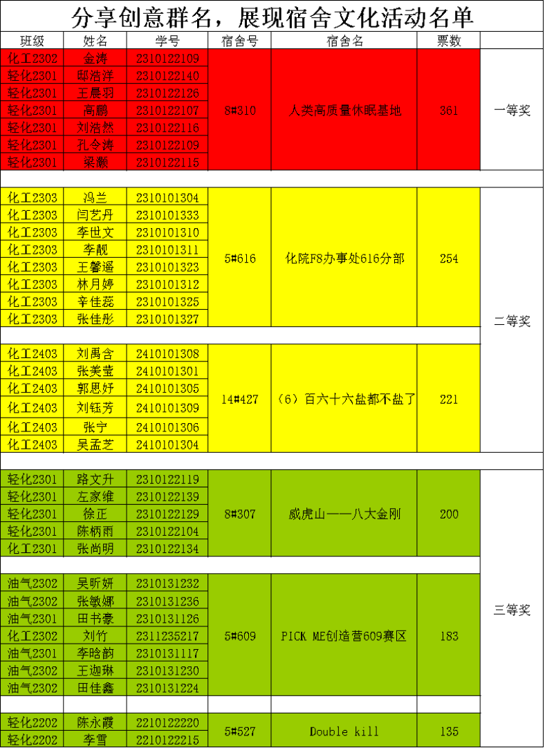为增强宿舍成员之间的凝聚力,营造更加温馨和谐的宿舍氛围,石油化工学院学生会生活部于2025年3月20日至2025年3月24日开展“分享创意群名,展现寝室文化”活动。此次活动旨在展示同学们的创意与团队合作精神,通过投票选出最具特色和意义的宿舍群名。