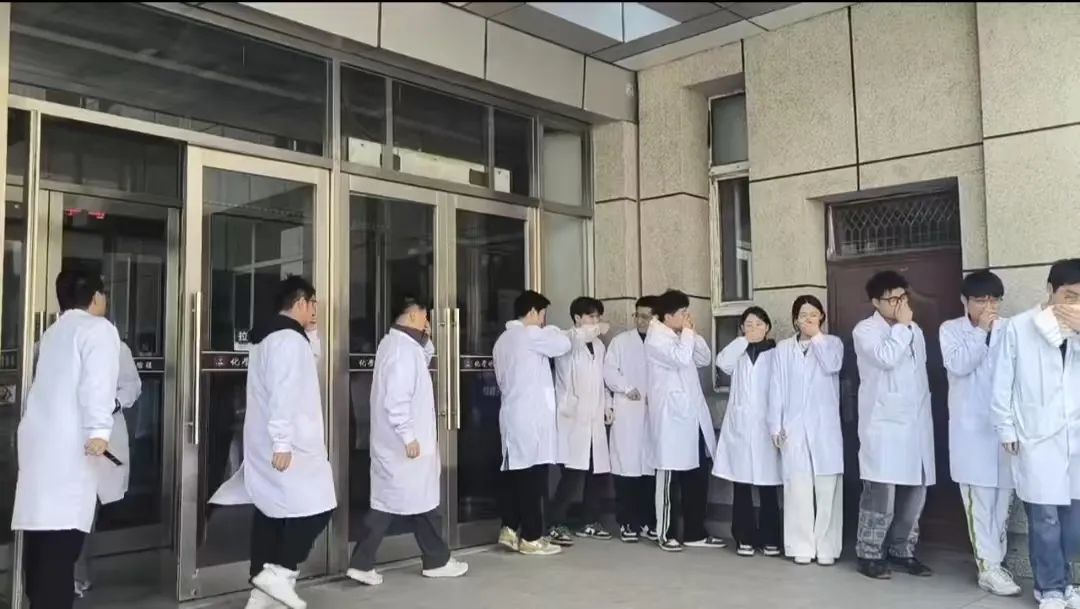 实验室演练中,模拟因实验操作不当突发火灾。同学立即拨打校园报警电话,实验室管理人员迅速穿戴防护装备赶到,使用灭火器进行灭火。研究生导师组织学生用湿毛巾捂住口鼻,弯腰低姿沿预定路线有序撤离。全员安全撤离后,研究生导师清点学生人数并汇报整体疏散情况。随后,后勤保障组及时对实验室进行清理与设备检查。