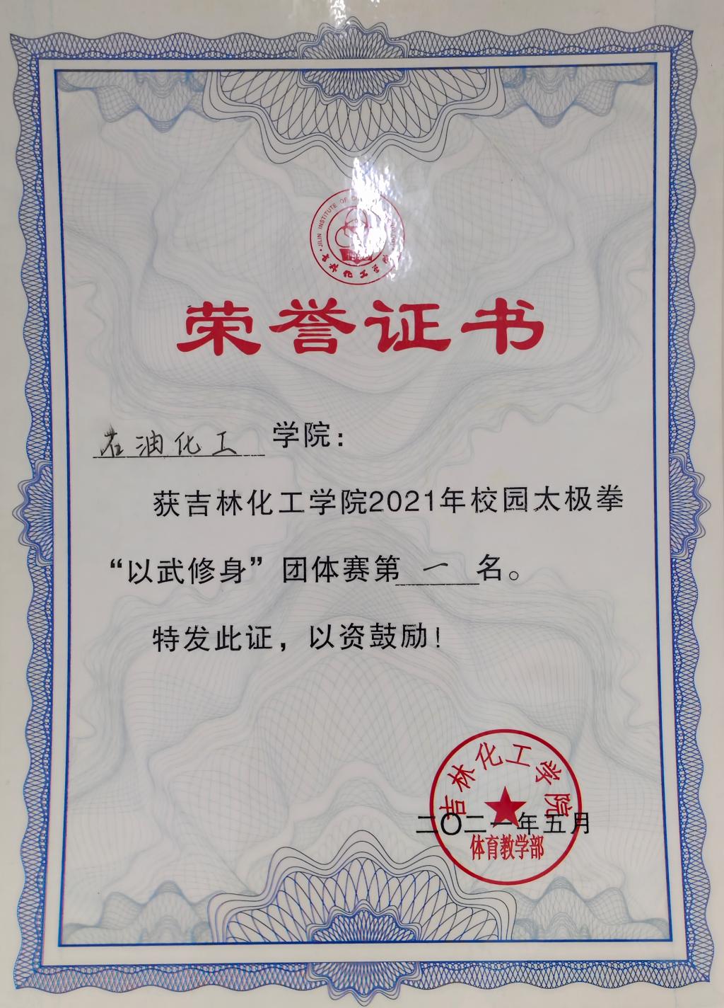 石油化工学院荣获2021年校园太极拳“以武修身”团体赛第一名